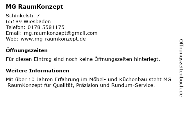 | Öffnungszeiten MG RaumKonzept in Wiesbaden anzeigen | |