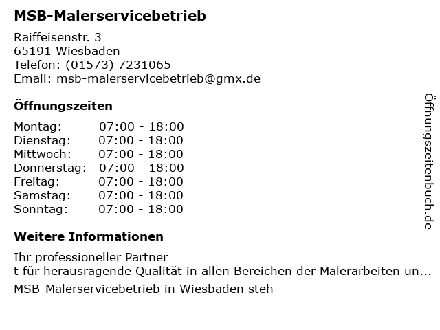 | Öffnungszeiten MSB-Malerservicebetrieb in Wiesbaden anzeigen | |