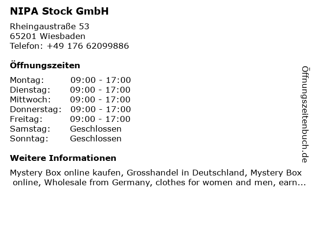 | Öffnungszeiten NIPA Stock GmbH in Wiesbaden anzeigen | |