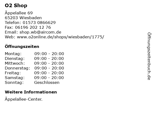 | Öffnungszeiten O2 Shop in Wiesbaden anzeigen | |