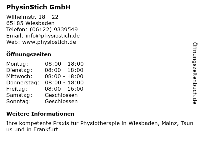 | Öffnungszeiten PhysioStich GmbH in Wiesbaden anzeigen | |