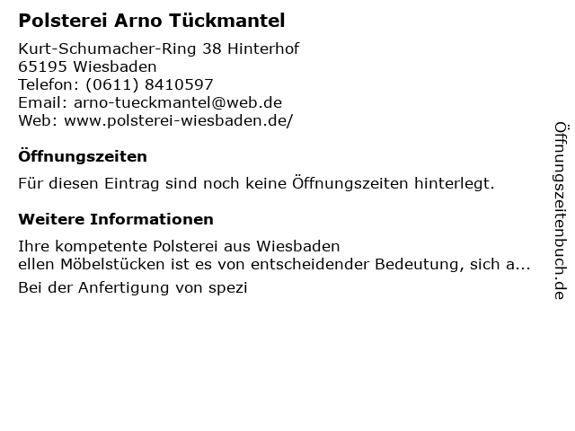| Öffnungszeiten Polsterei Arno Tückmantel in Wiesbaden anzeigen | |