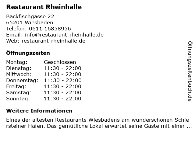 | Öffnungszeiten Restaurant Rheinhalle in Wiesbaden anzeigen | |