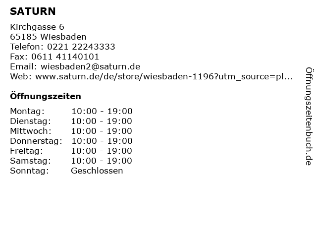 | Öffnungszeiten SATURN in Wiesbaden anzeigen | |