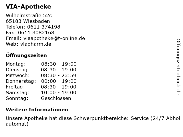 | Öffnungszeiten VIA-Apotheke in Wiesbaden anzeigen | |