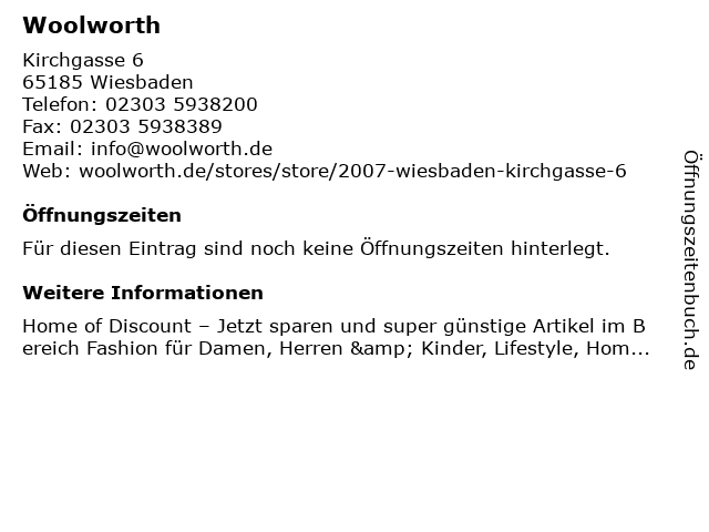 | Öffnungszeiten Woolworth in Wiesbaden anzeigen | |