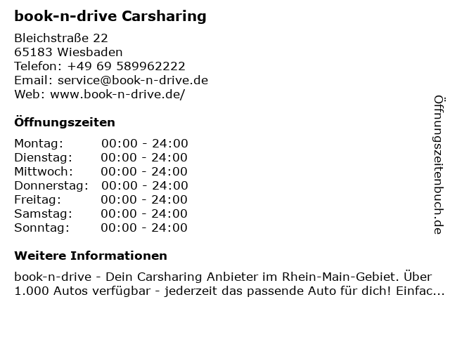 | Öffnungszeiten book-n-drive Carsharing in Wiesbaden anzeigen | |