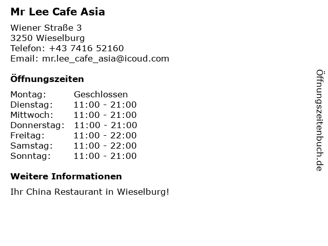 | Öffnungszeiten Mr Lee Cafe Asia in Wieselburg anzeigen | |