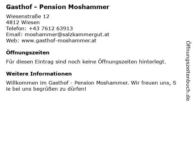| Öffnungszeiten Gasthof - Pension Moshammer in Wiesen anzeigen | |