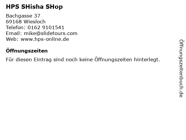 | Öffnungszeiten HPS SHisha SHop in Wiesloch anzeigen | |