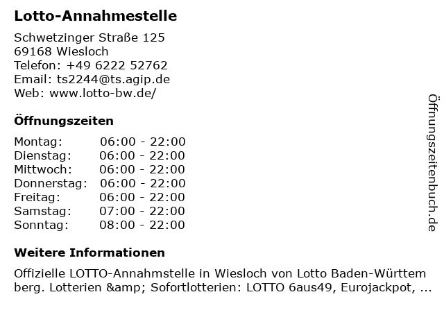 | Öffnungszeiten Lotto-Annahmestelle in Wiesloch anzeigen | |