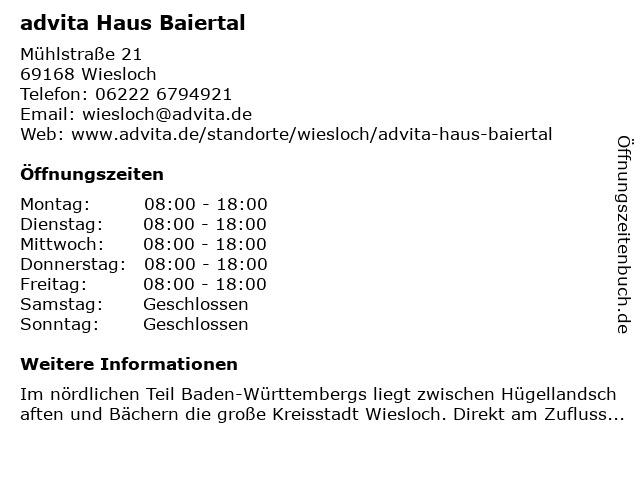 Öffnungszeiten advita Haus Baiertal in Wiesloch anzeigen | |
