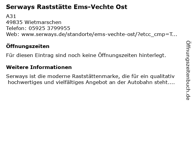 Branchen & Suchbegriffe zu Serways Raststätte Ems-Vechte Ost:ems, ost, raststätte, restaurants, serways, vechte |