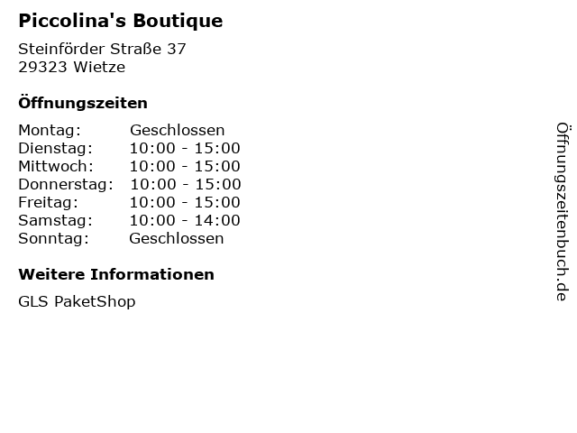 | Öffnungszeiten Piccolina's Boutique in Wietze anzeigen | |