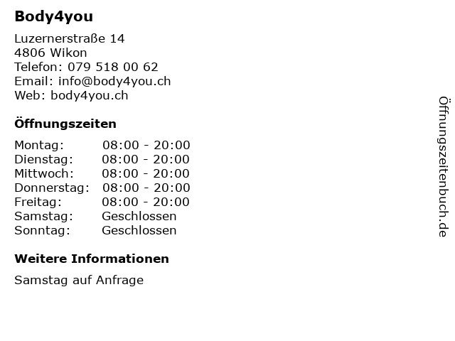 | Öffnungszeiten Body4you in Wikon anzeigen | |