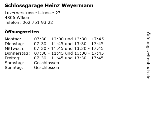 | Öffnungszeiten Schlossgarage Heinz Weyermann in Wikon anzeigen | |