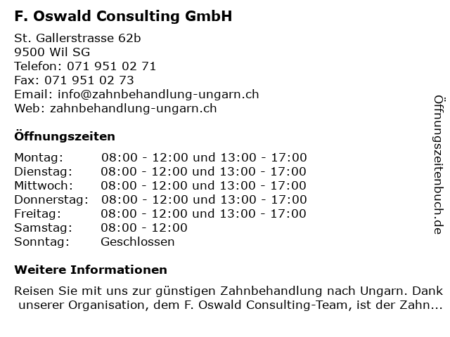 | Öffnungszeiten F. Oswald Consulting GmbH in Wil SG anzeigen | |