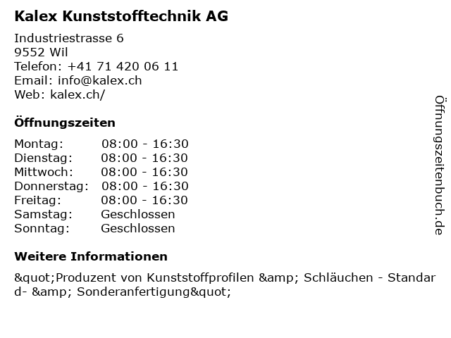 | Öffnungszeiten Kalex Kunststofftechnik AG in Wil anzeigen | |