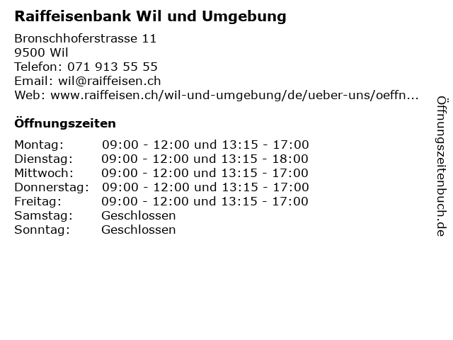 | Öffnungszeiten Raiffeisenbank Wil und Umgebung in Wil anzeigen | |