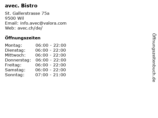 | Öffnungszeiten avec. Bistro in Wil anzeigen | |