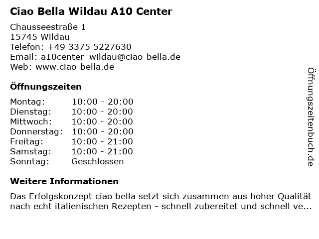 | Öffnungszeiten Ciao Bella Wildau A10 Center in Wildau anzeigen | |