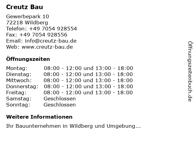 | Öffnungszeiten Creutz Bau in Wildberg anzeigen | |
