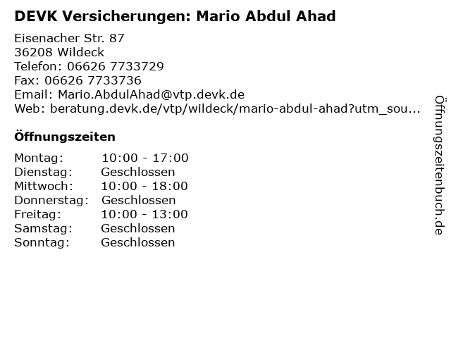 2 DEVK Versicherung: Michael Hoffmann / Agenturvertreter (Entfernung: 0,00 km) Eisenacher Str. 87, 36208 Wildeck 4 DEVK Versicherung Erich Horchler Hauptvertreter (Entfernung: 0,75 km) Industriestraße 12, 36208 Wildeck 6 |