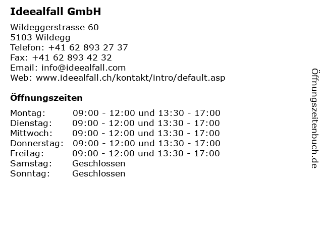 | Öffnungszeiten Ideealfall GmbH in Wildegg anzeigen | |