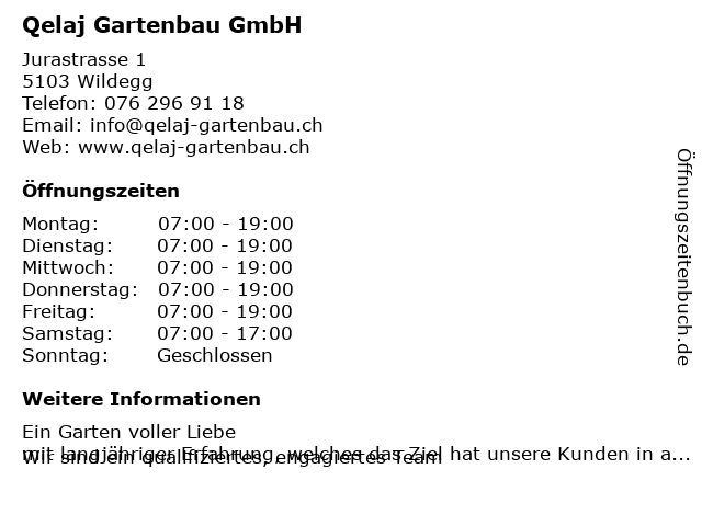 | Öffnungszeiten Qelaj Gartenbau GmbH in Wildegg anzeigen | |