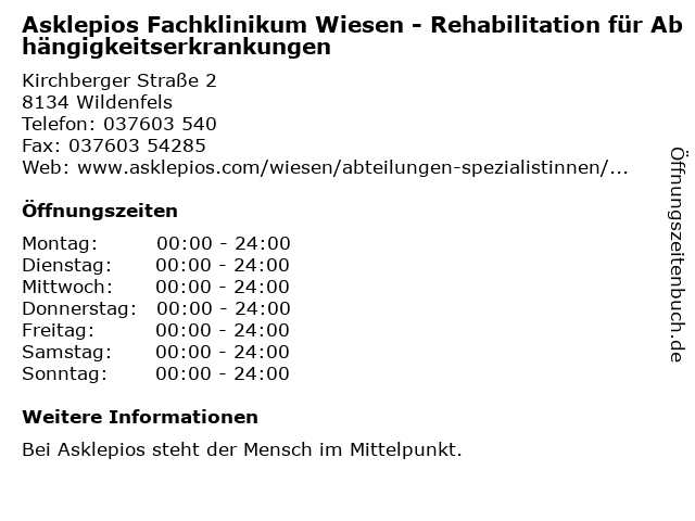 1 Asklepios Fachklinikum Wiesen - Physiotherapie (Entfernung: 0,00 km) Kirchberger Straße 2, 08134 Wildenfels 2 Asklepios Fachklinikum Wiesen - Psychiatrie und Psychotherapie (Entfernung: 0,00 km) Kirchberger Straße 2, 08134 Wildenfels 3 Asklepios Fachklinikum Wiesen - Patientenaufnahme (Entfernung: 0,07 km) Kirchberger Straße 2, 08134 Wildenfels 4 Asklepios Fachklinikum Wiesen - Besuchszeiten (Entfernung: 0,07 km) Kirchberger Straße 2, 08134 Wildenfels 5 Asklepios Fachklinikum Wiesen - Psychiatrische Institutsambulanz (Entfernung: 0,07 km) Kirchberger Straße 2, 08134 Wildenfels 6 Asklepios Fachklinikum Wiesen (Entfernung: 0,09 km) Kirchberger straße 2, 08134 Wildenfels, Ortsteil Wiesenburg |