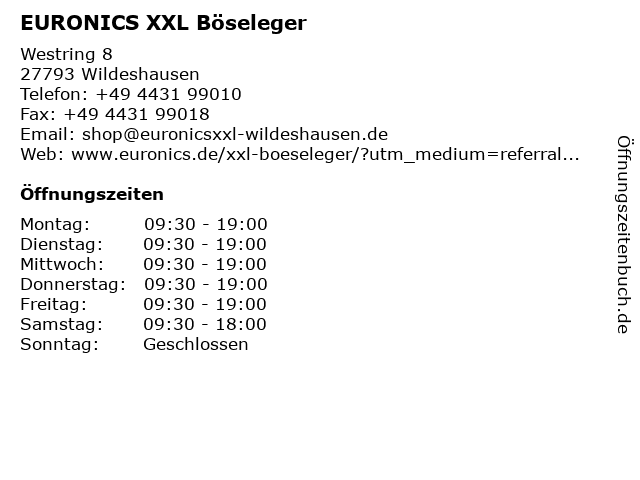 | Öffnungszeiten EURONICS XXL Böseleger in Wildeshausen anzeigen | |