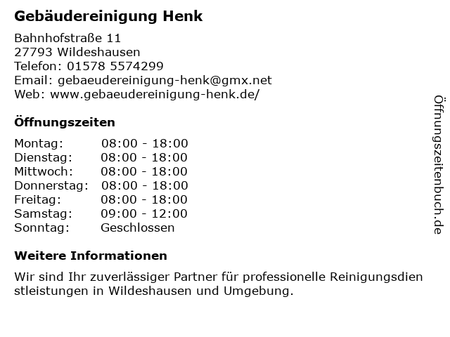 | Öffnungszeiten Gebäudereinigung Henk in Wildeshausen anzeigen | |