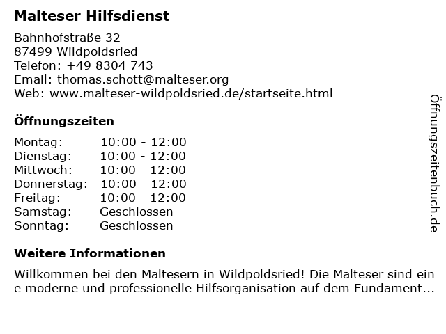 | Öffnungszeiten Malteser Hilfsdienst in Wildpoldsried anzeigen | |
