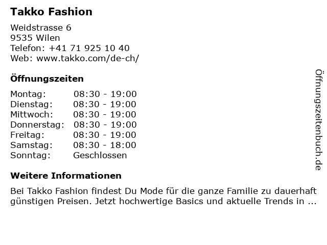 | Öffnungszeiten Takko Fashion in Wilen anzeigen | |