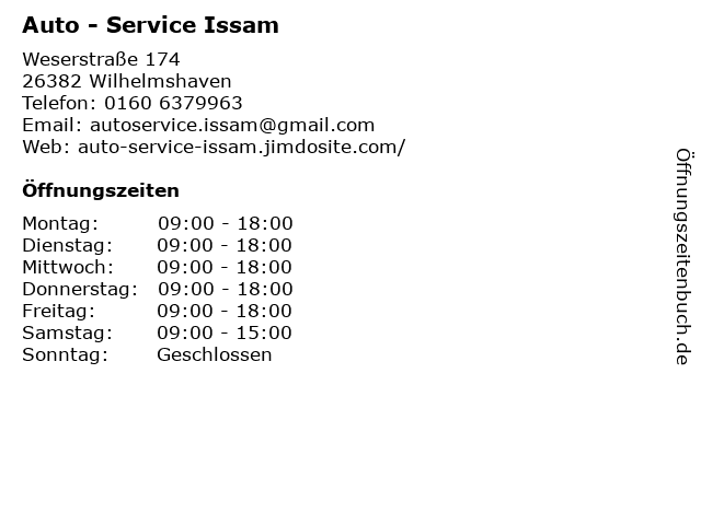 | Öffnungszeiten Auto - Service Issam in Wilhelmshaven anzeigen | |