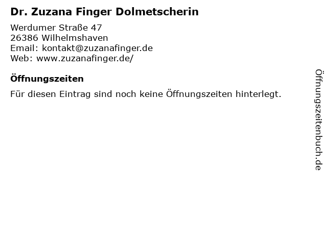 | Öffnungszeiten Dr. Zuzana Finger Dolmetscherin in Wilhelmshaven anzeigen | |