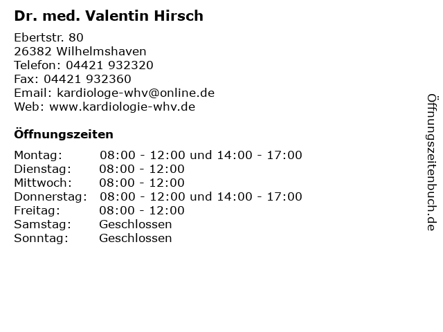 1 Dr. med. Manfred Hirsch & Kollegen - Facharzt für Innere Medizin und Kardiologie (Entfernung: 0,02 km) Ebertstr 80, 26382 Wilhelmshaven 4 Albrecht u. Gunnar Hirsch Ingenieurbüro (Entfernung: 41,49 km) Eike-von-Repkow-Str. 32 A, 26121 Oldenburg 5 Ingenieurbüro Hirsch Ingenieurbüro für Tiefbau (Entfernung: 41,50 km) Eike-von-Repkow-Str. 32a, 26121 Oldenburg 6 |