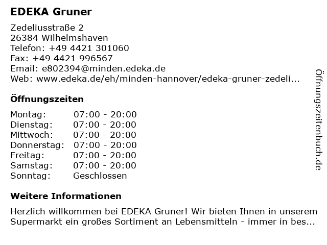 | Öffnungszeiten EDEKA Gruner in Wilhelmshaven anzeigen | |