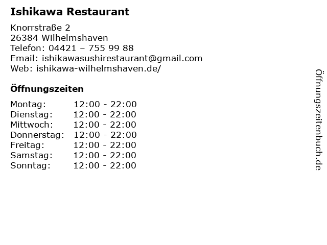 | Öffnungszeiten Ishikawa Restaurant in Wilhelmshaven anzeigen | |