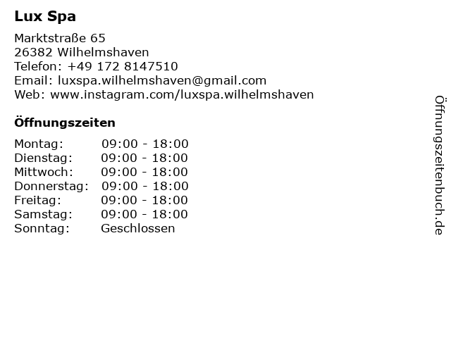 | Öffnungszeiten Lux Spa in Wilhelmshaven anzeigen | |