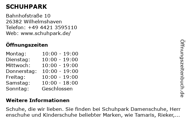 | Öffnungszeiten SCHUHPARK in Wilhelmshaven anzeigen | |
