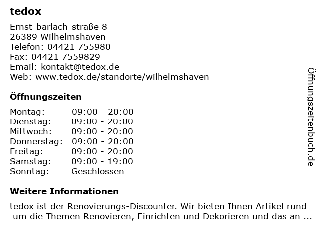 | Öffnungszeiten tedox in Wilhelmshaven anzeigen | |