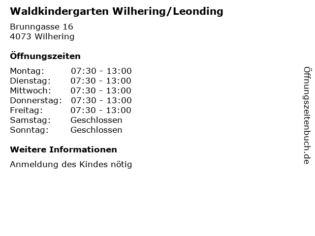 | Öffnungszeiten Waldkindergarten Wilhering/Leonding in Wilhering anzeigen | |