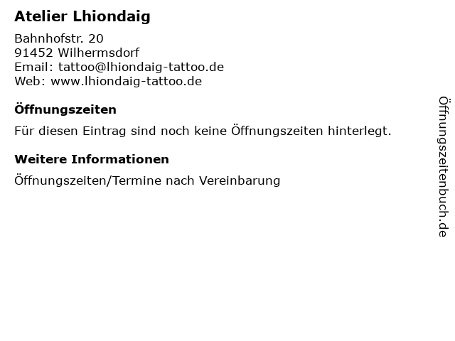 | Öffnungszeiten Atelier Lhiondaig in Wilhermsdorf anzeigen | |