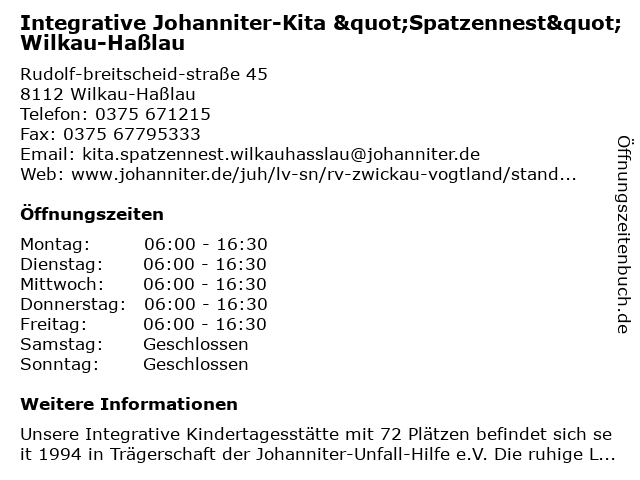 Branchen & Suchbegriffe zu Integrative Johanniter-Kita "Spatzennest" Wilkau-Haßlau:"spatzennest", agentur für kinderbetreuung, gemeinnützige organisation, haßlau, hilfsorganisation, integrative, johanniter, kita, sozialarbeit, verband, wohlfahrtseinrichtung |