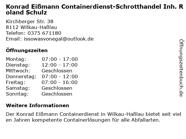 Branchen & Suchbegriffe zu Konrad Eißmann Containerdienst-Schrotthandel Inh. Roland Schulz:containerdienst, eißmann, konrad, roland, schrotthandel, schulz |