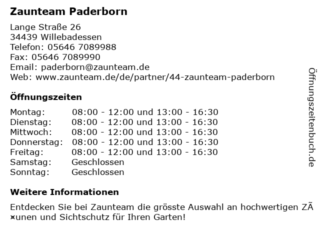 | Öffnungszeiten Zaunteam Paderborn in Willebadessen anzeigen | |