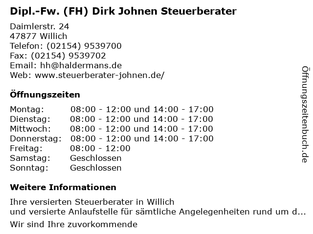 4 Dipl.-Wirdtsftsjur. (FH) Andreas Dohngans, Steuerberater (Bürozeiten) (Entfernung: 3,10 km) Feldstraße 1 A, 47877 Willich 6 |