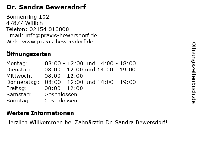 | Öffnungszeiten Dr. Sandra Bewersdorf in Willich anzeigen | |