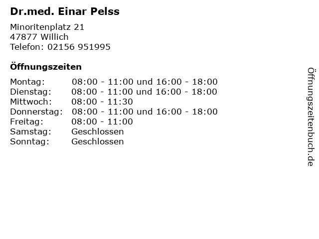 | Öffnungszeiten Dr.med. Einar Pelss in Willich anzeigen | |